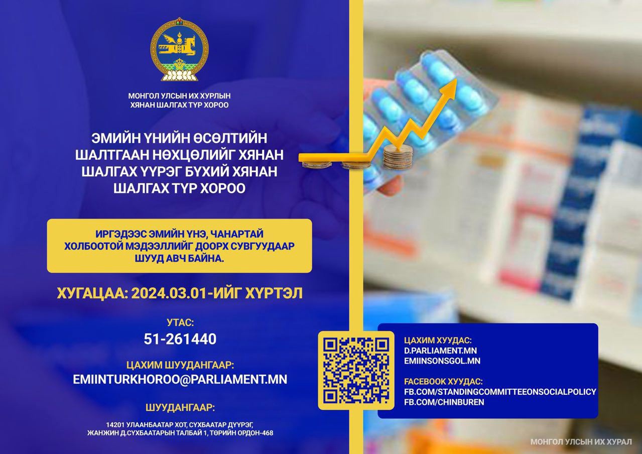 “Эмийн үнийн өсөлтийн шалтгаан, нөхцөлийг хянан шалгах үүрэг бүхий Түр хороо” Монгол Улсын Их Хурлын 2023 оны 06 дугаар сарын 30-ны өдрийн 60 дугаар тогтоолоор байгуулагдаж, хянан шалгах түр хорооны даргаар, Улсын Их Хурлын гишүүн Ж.Чинбүрэн, Түр хорооны гишүүдээр Улсын Их Хурлын гишүүн Д.Батлут, Б.Бейсен, Б.Жаргалмаа, М.Оюунчимэг, Ц.Сандаг-Очир, Ц.Туваан ажиллаж байгаа билээ.